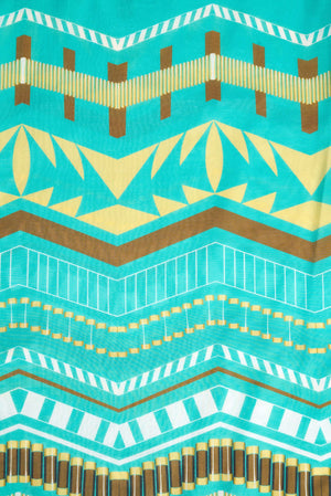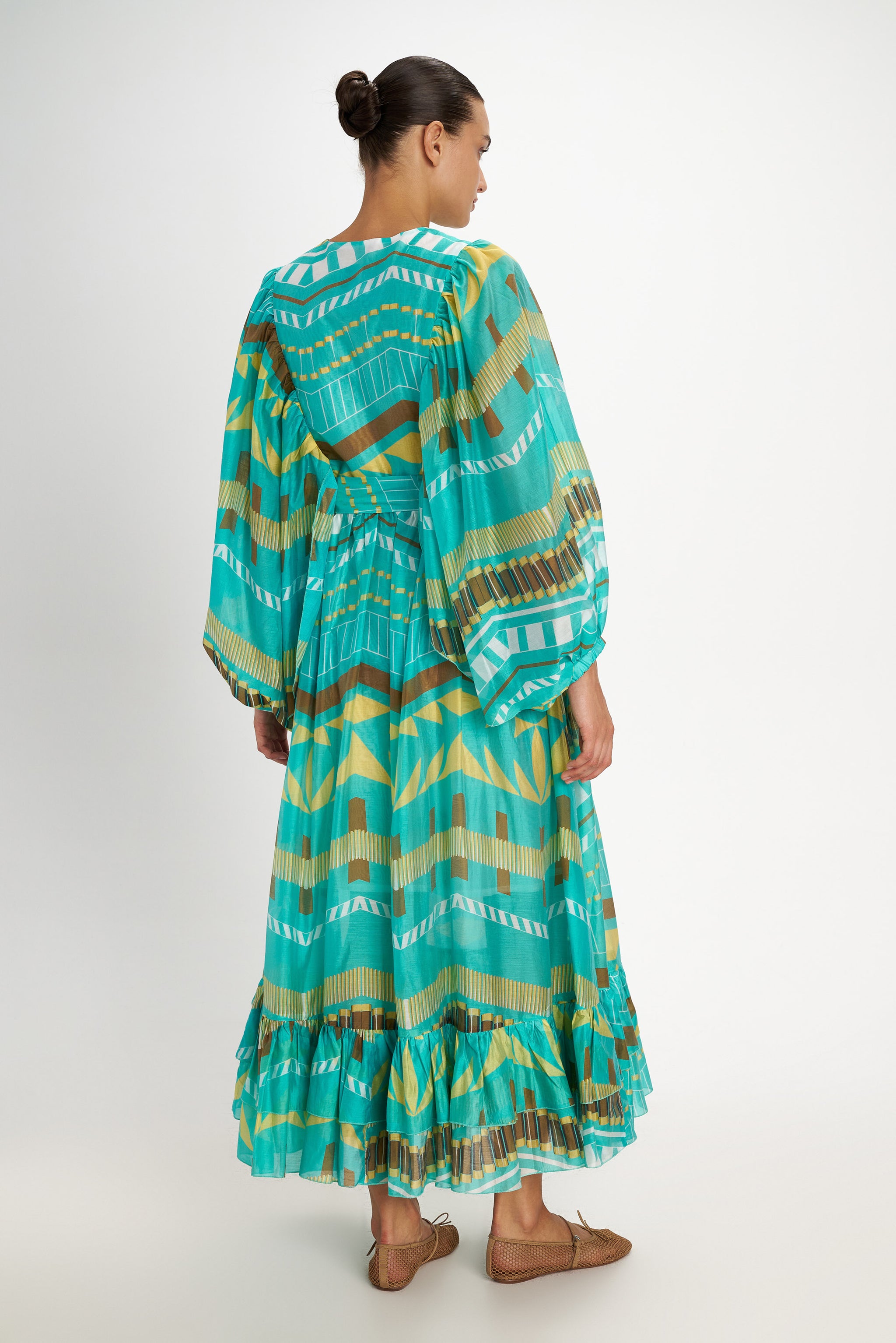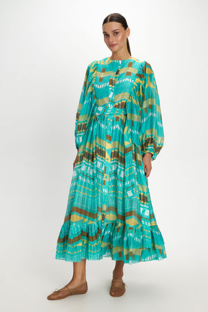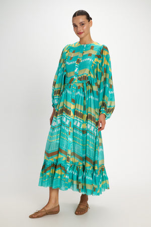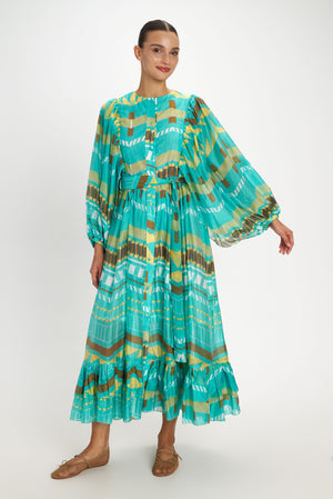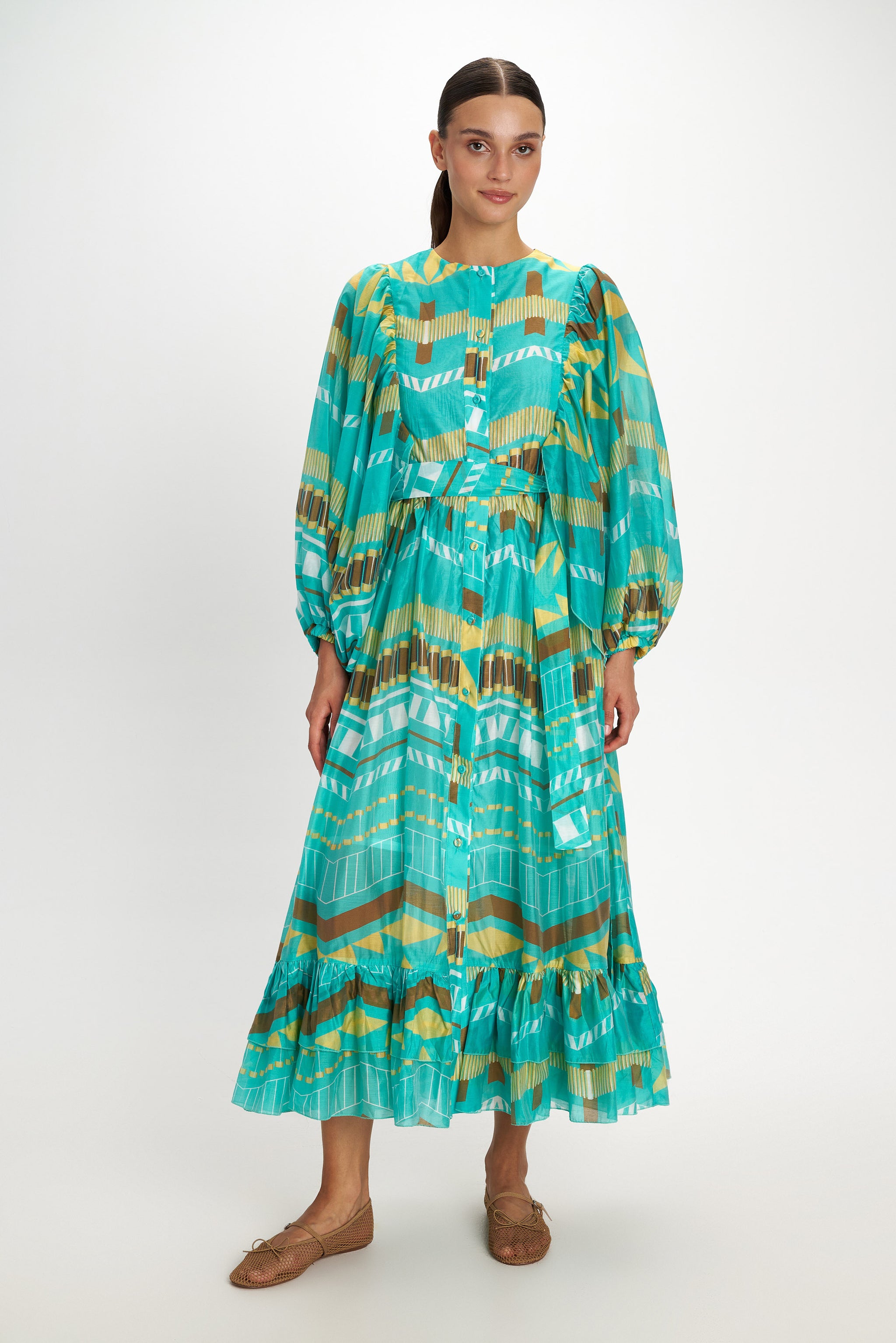 Beautiful patterns adorn this button down round-collared dress. With stunning details like its wide puffy sleeves that fall and adjust at the wrists. The dress is lightly adjusted at the waist with an elastic and besides, includes a matching self tie belt. The easy fall, flowy skirt has a bottom tiered hem.
