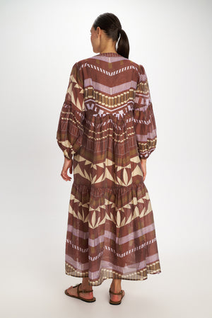 Pearl & Caviar's Zakar maxi dress reflects unique character with itsbubble sleeves and v neckline with self-tie tassels. The relaxed-fit maxi has a tiered construction that is highlighted with an array of geometric motifs that are inspired by classical architecture.