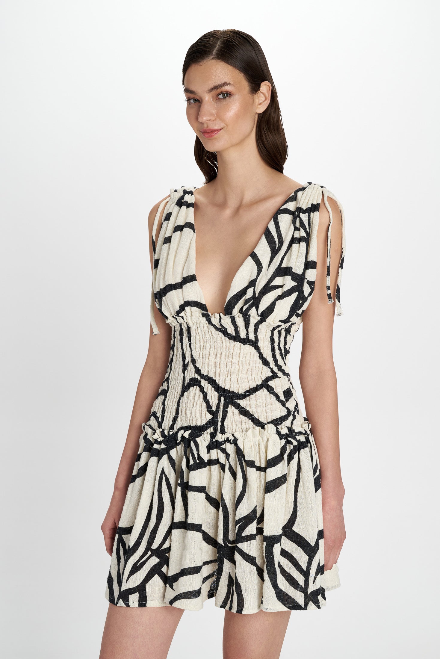 This sexy mini dress is a perfect addition to your summer looks for a casual fresh look or a night out. Made up of three stunning parts: 1. the top has a plunging neckline with thick shoulder straps that have straps to adjust and an open back that matches the front part. 2. the bodice adjusts to your body ideally with its tube top style elastic tiered finish and 3. the tiered skirt with a comfortable fall.