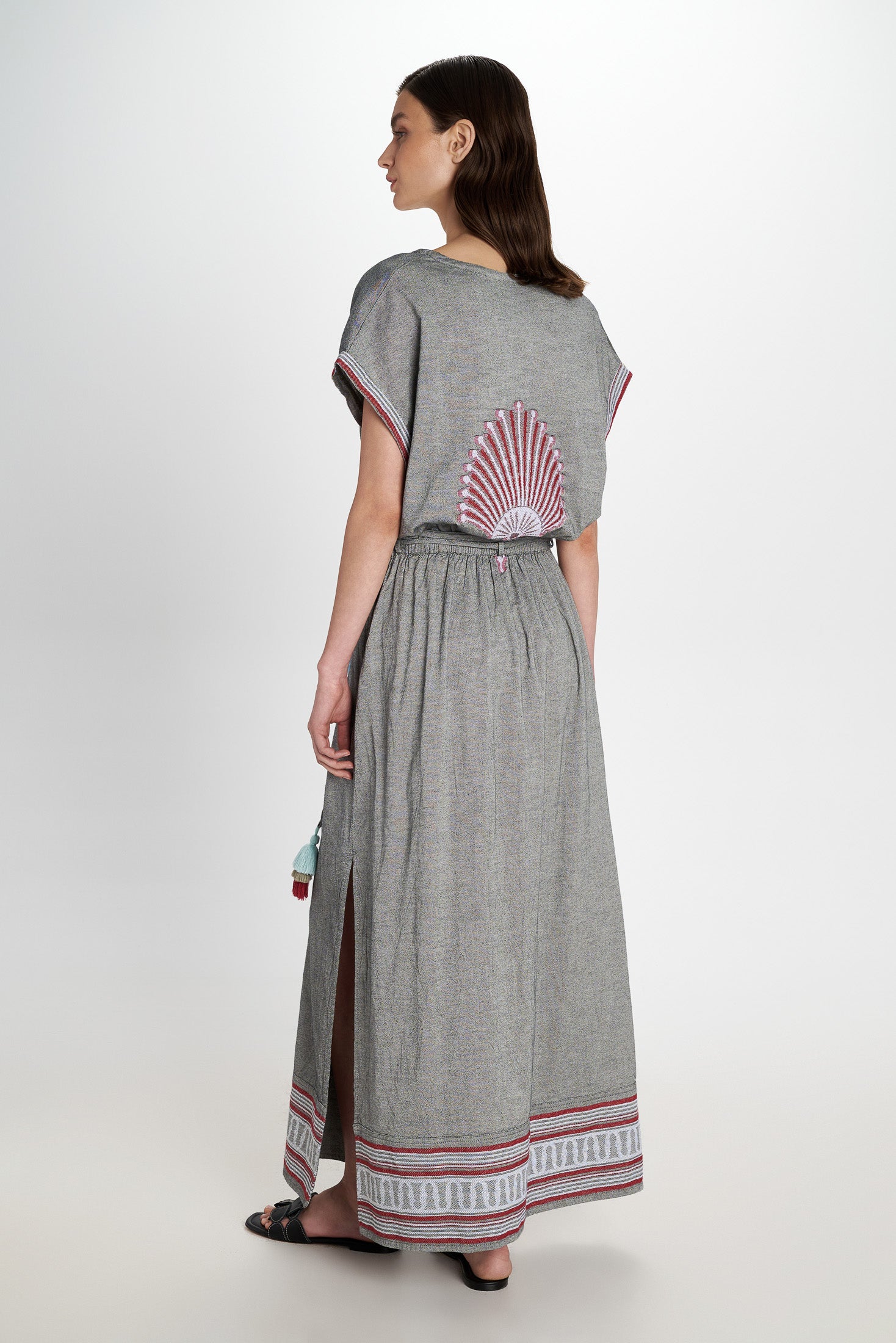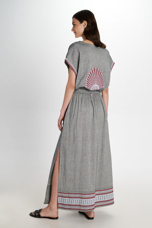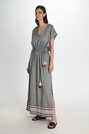 Beautiful patterns and fabric adorn this short sleeved Maxi Dress which features full length with side slits. A V neckline and a tiered waist with decorative self tie tassels.