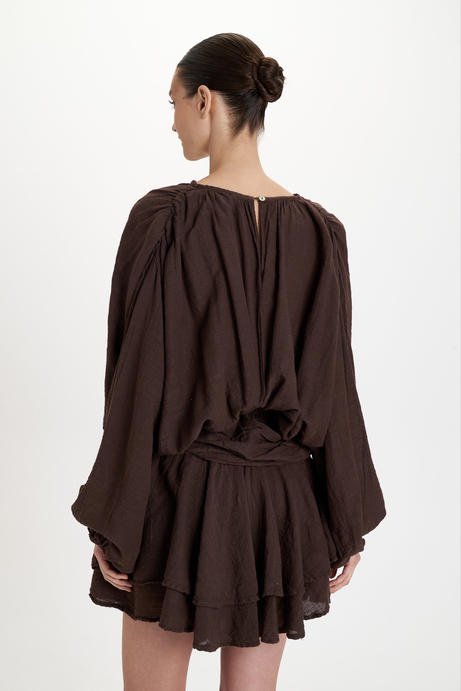 This beautiful Pearl and Caviar mini gauze dress features collar neck with self tie tassels that lead into a slight v neckline. It has a pleated bodice and a self tie belt to adjust as you prefer.