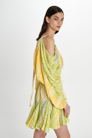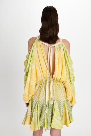 Pearl and Caviar brings to life a totally different and original piece. Open shoulders with ruffles as design accentuating a feminine look. Perfect for a casual stylish look or dress it up for a night out. Details all the way through the dress, from a V neckline, flowy long sleeves and a pleated skirt. Open V back with adjustable self tie to adjust top part and another one to adjust at waist as desired.