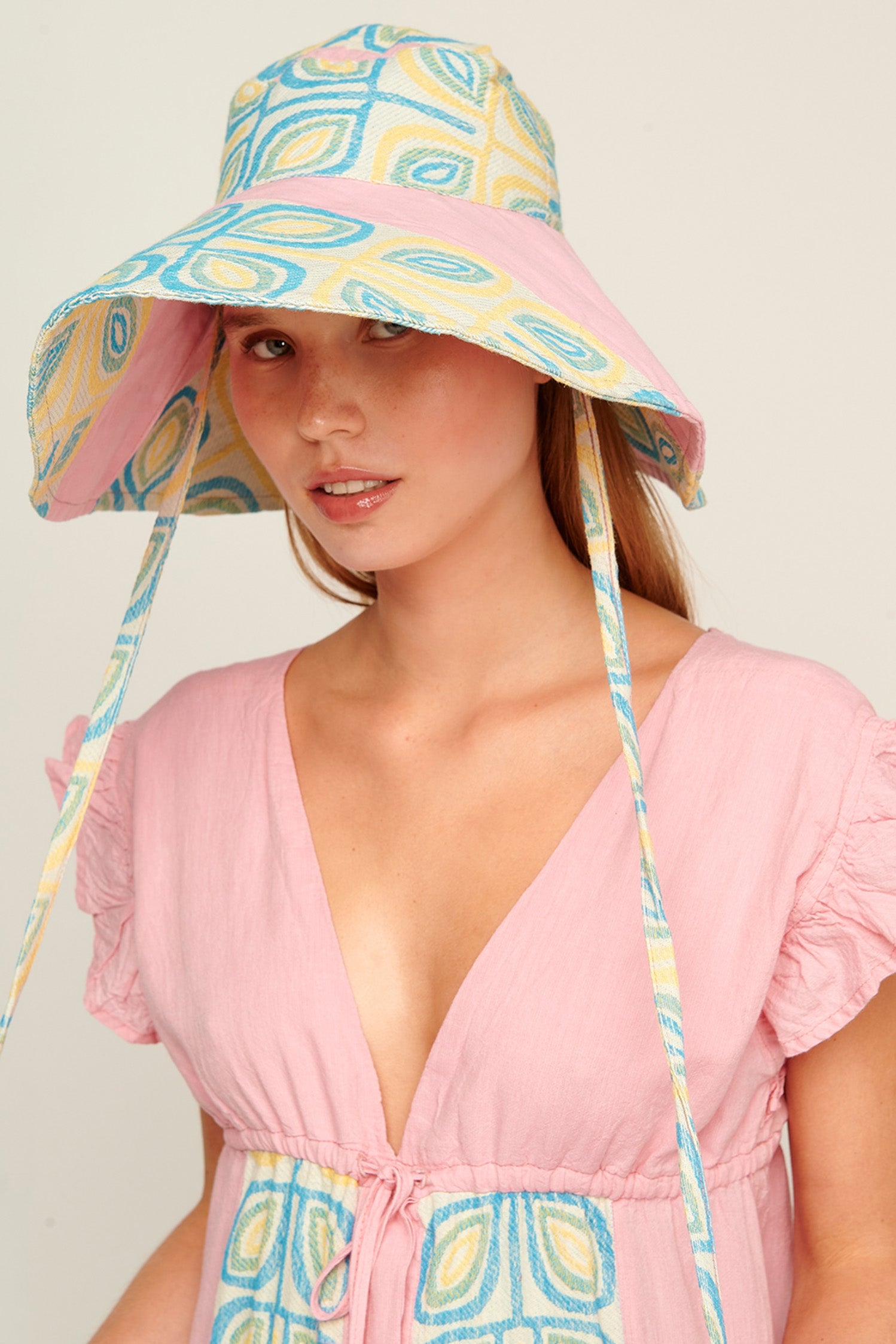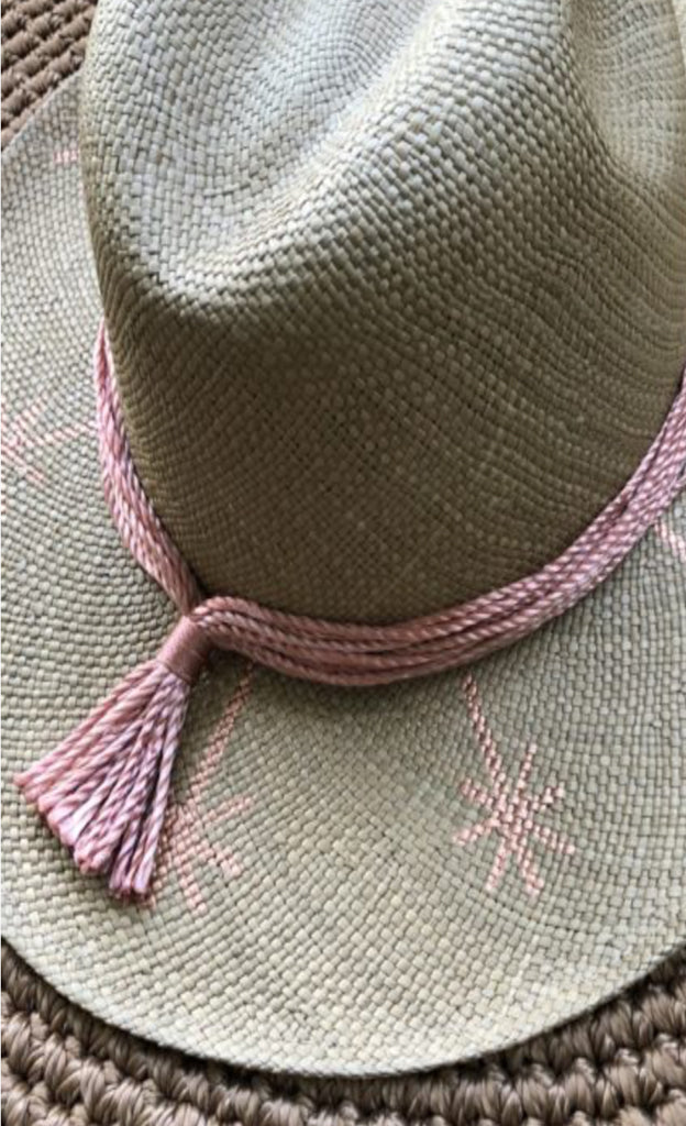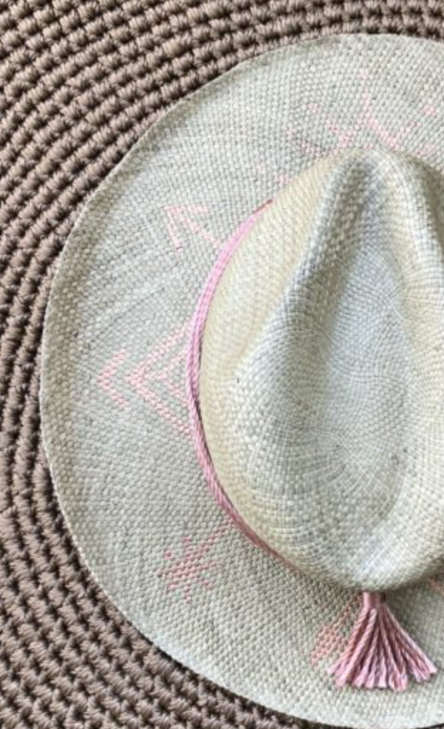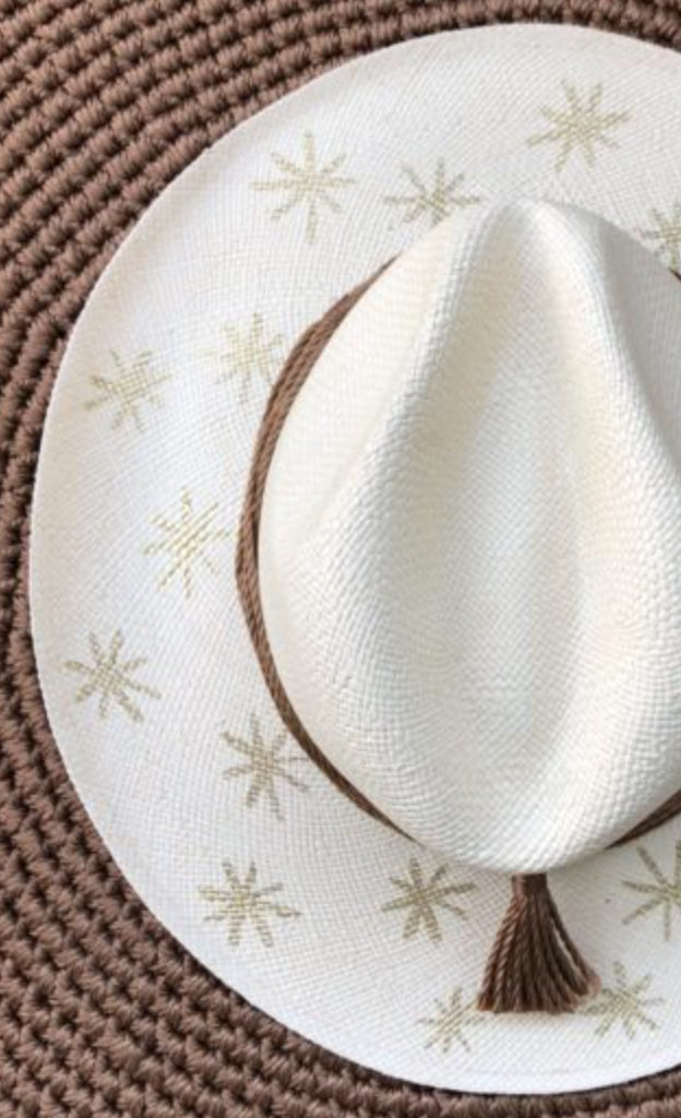 Equadorian palm hats hand painted by artisans in Tulum, Mexico.