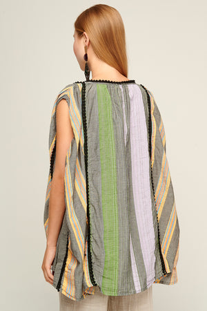 This beautiful Striped Blouse features a loose bohemian style with a plunging v neckline, shoulder length sleeves, and alternating stripe panels for an effortless look!