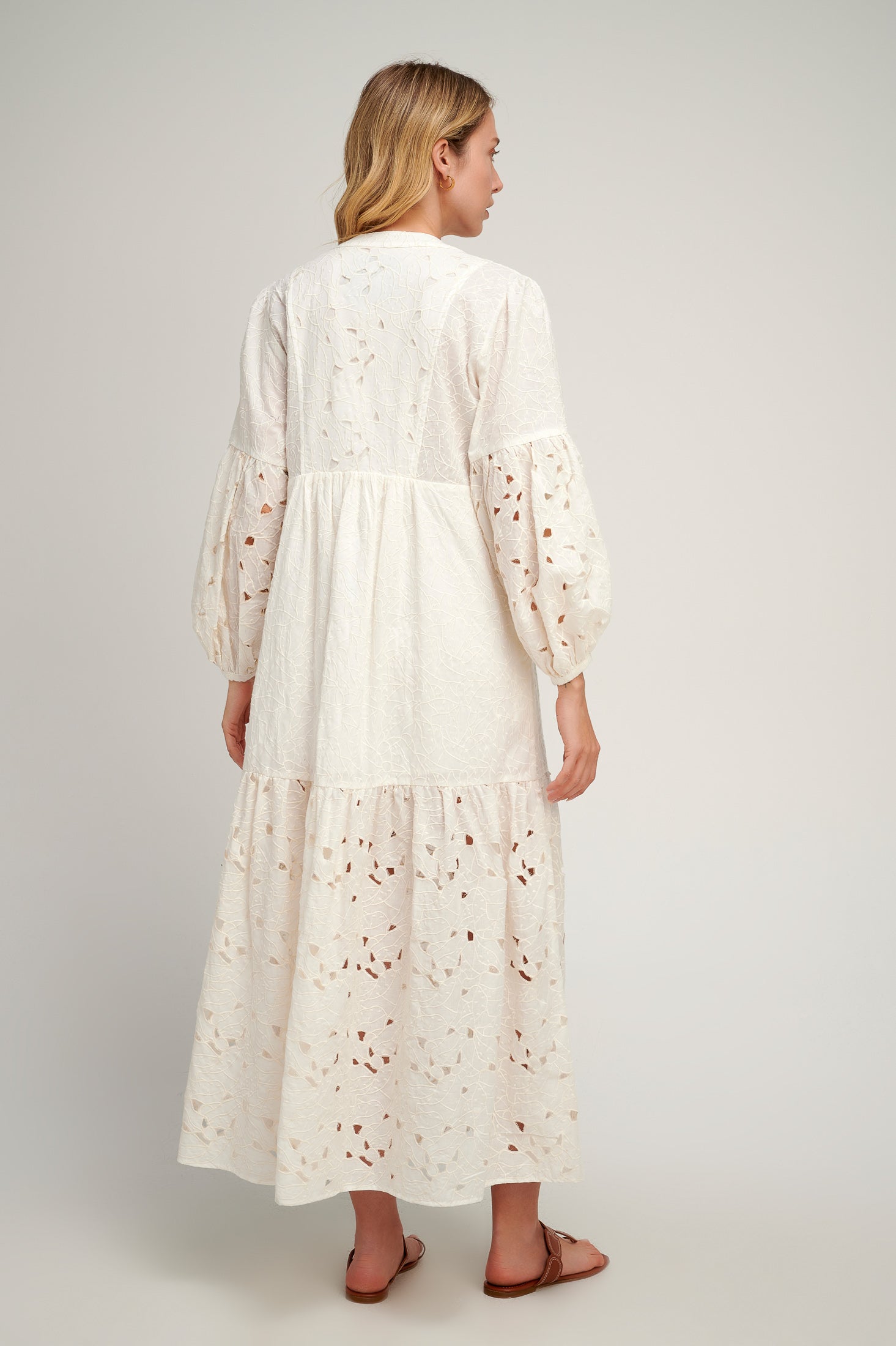 Pearl & Caviar's Zakar maxi dress reflects unique character with itsbubble sleeves and v neckline with keyhole and tassels. Artisanally handcrafted in Greece, the relaxed-fit maxi has a tiered construction that is highlighted with an array of intricately handwoven geometric motifs that are inspired by classical architecture.