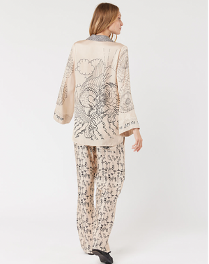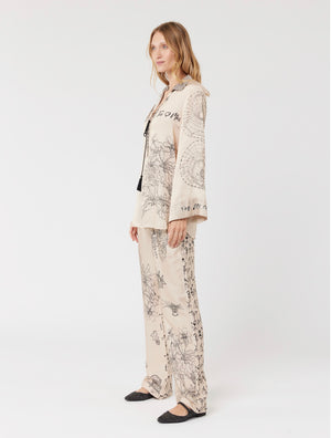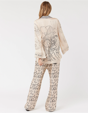 Graphic print straight leg trousers with elastic waist, side pockets and two back pockets. Print is ornate with both floral and geometric patterns. Available an black and tan. Pair with our western style shirts, or a tank or tee for an elevated boho look