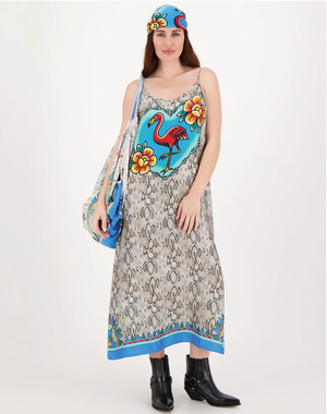 Mid length cami dress in our Snake Charmer print with a V-neck, spaghetti straps and a slit on the side. Print is gray snakeskin. Stylized graphic of a flamingo in a blue heart with flowers. Back is straight across and features a vintage stamp pattern. Hemline is trimmed in blue. Super cute easy to wear look.