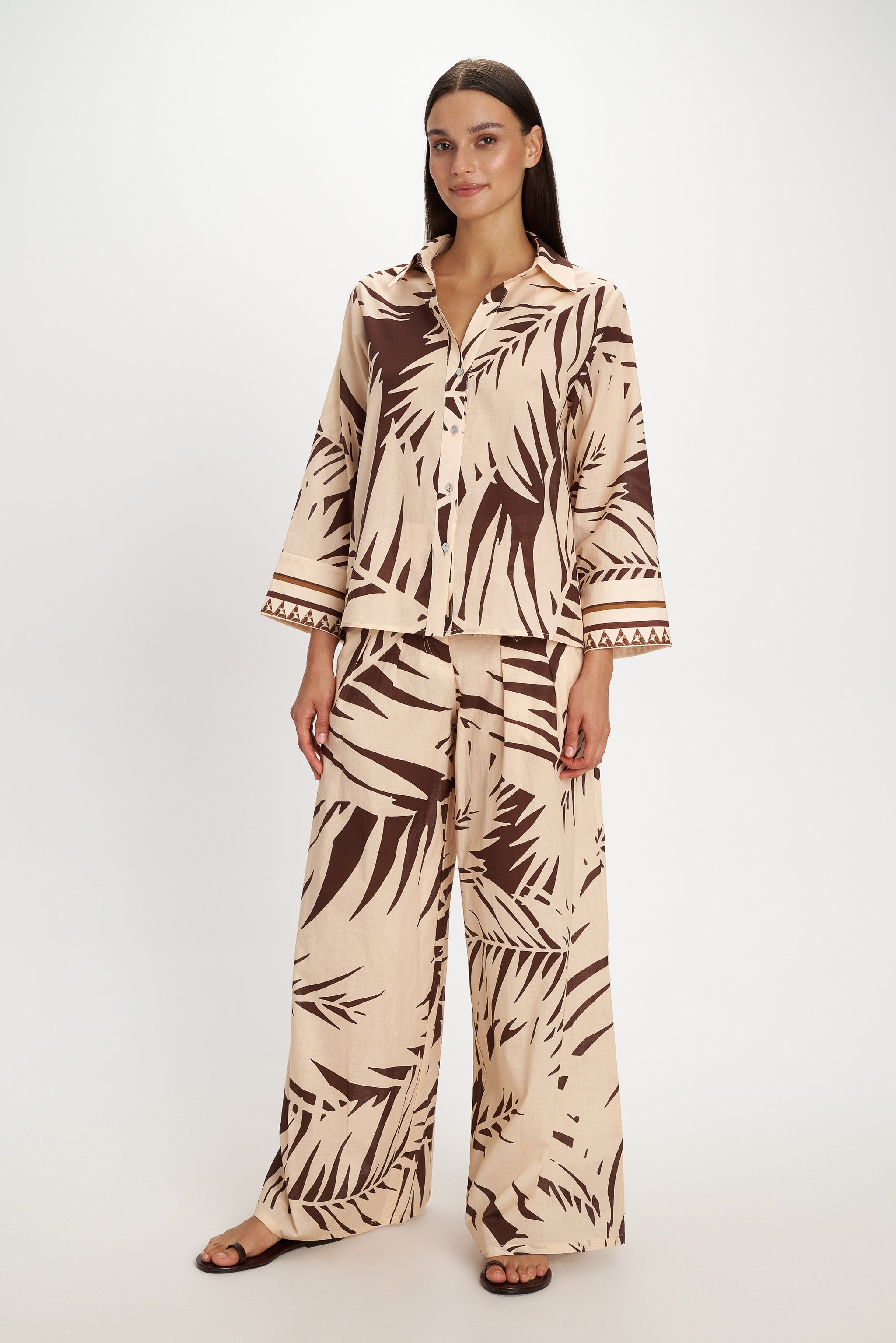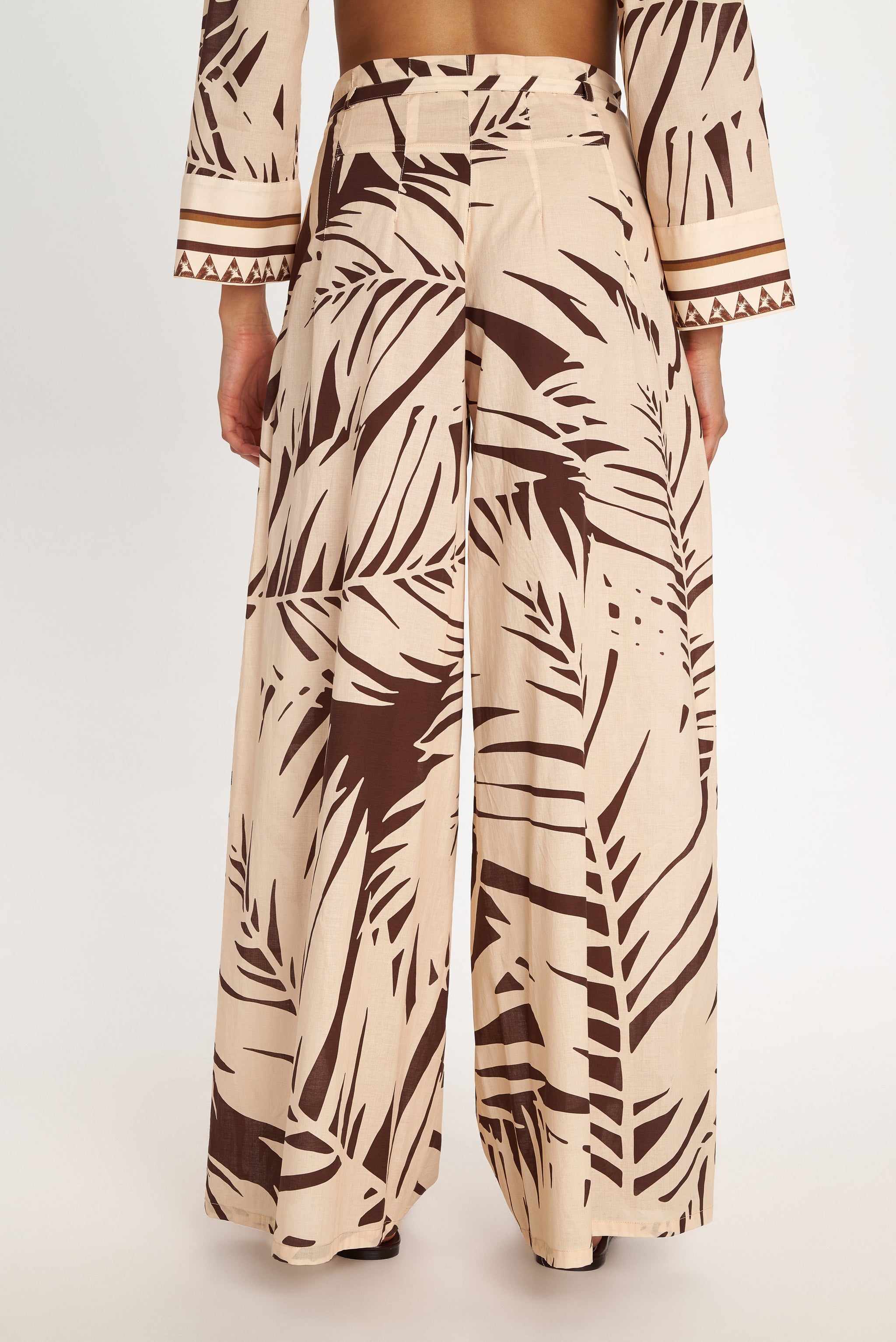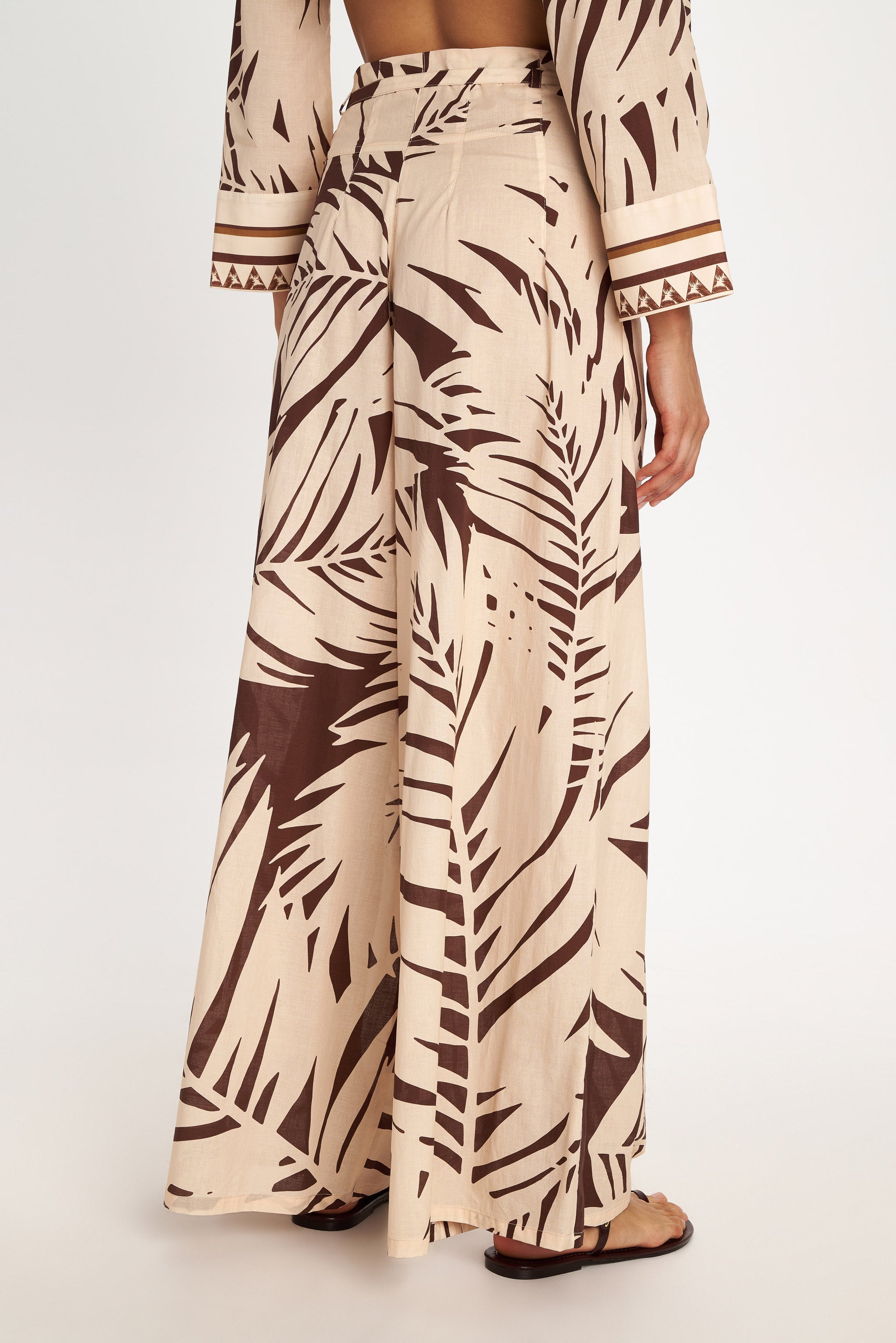 These wide leg pants fall below the ankle and have a zippered waist with an additional strap belt for extra adjustment. Complete the look with its matching lightweight fabric top or shirt.