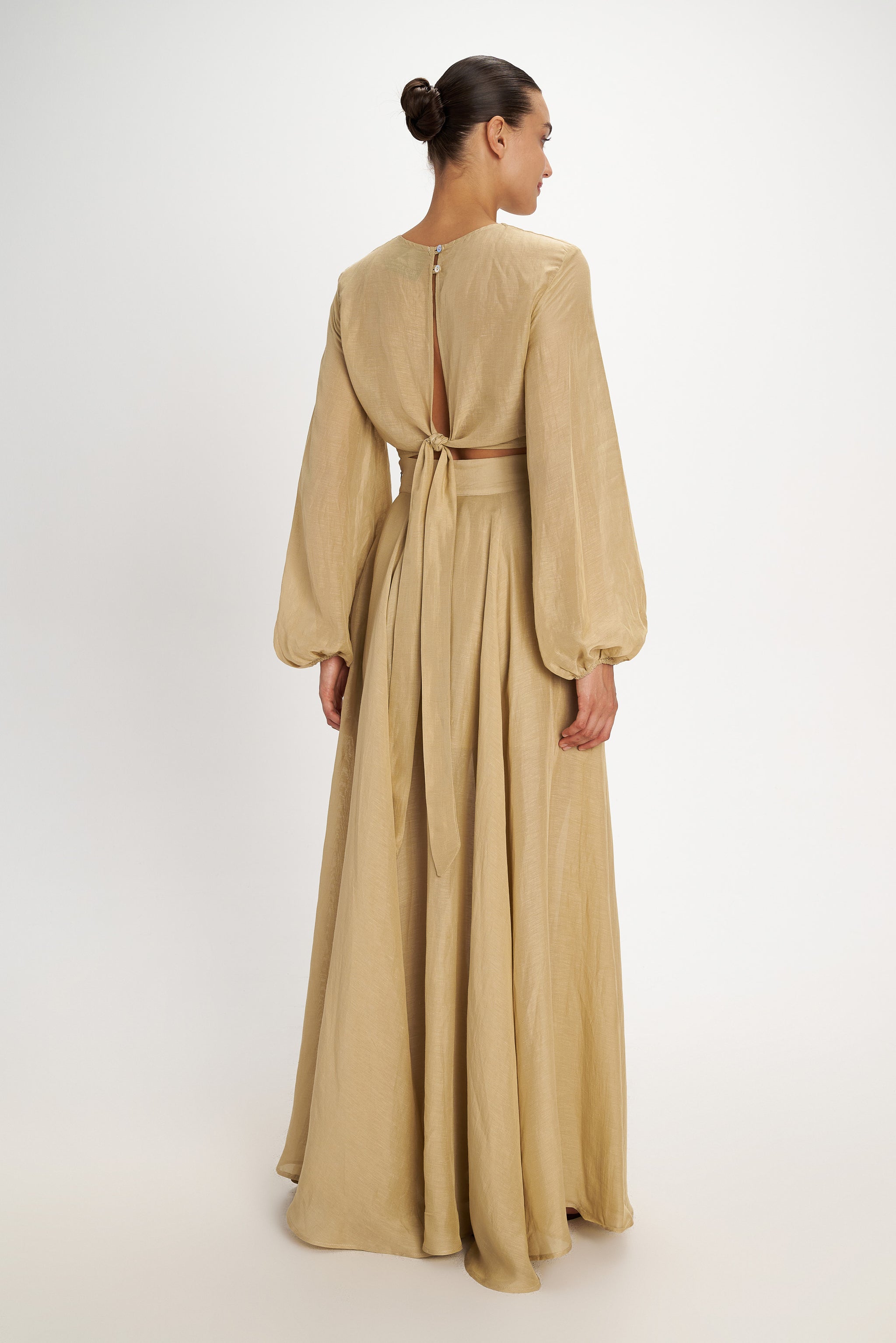 This top is a playful addition to any of the brand's skirts or shorts. It features a jewel neckline with a slight opening in the front and back, closing through the back with self-tie thick straps and buttons. The neckline is polished with a keyhole self-tie closure, complementing the bubble sleeves.