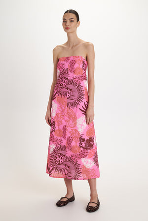 Beautiful patterns adorn this strapless midi dress with a clean flowy fall lightly adjusted at the waist by a side zipper.