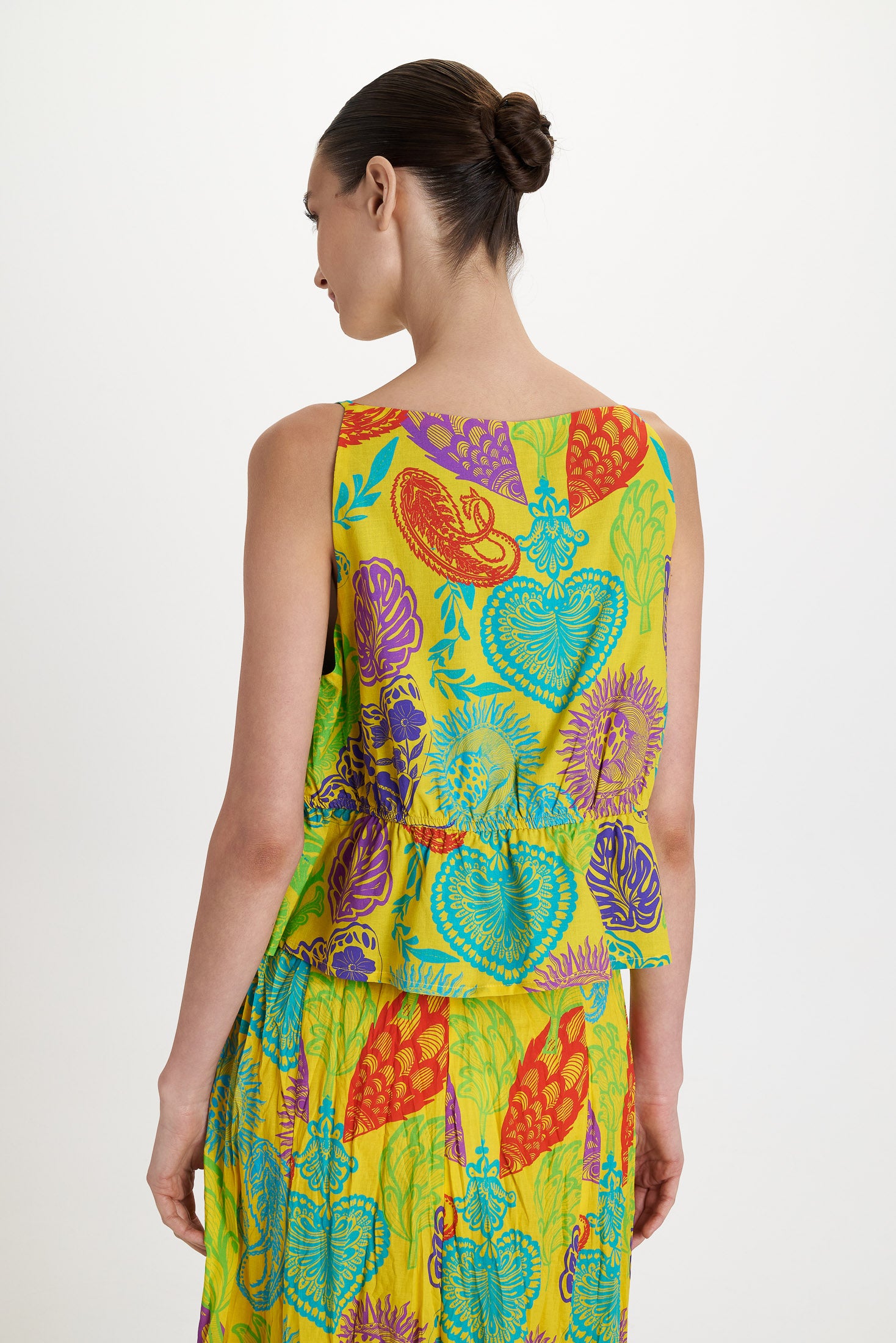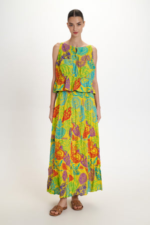 This beautifully printed top is perfect for any occasion. This top features a slight wide V neckline followed by a short slit and tiered fall. Complete the look with its matching maxi skirt.